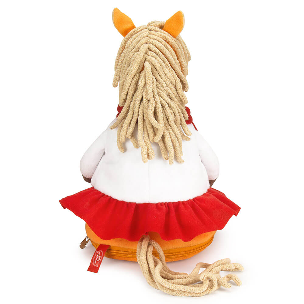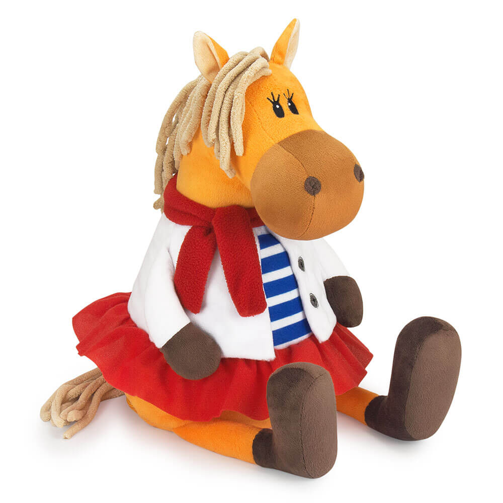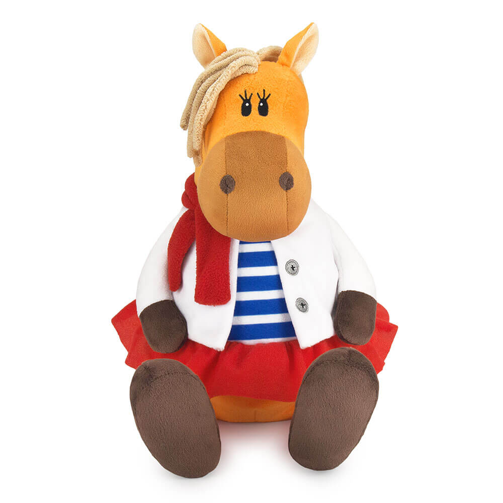 Новогодний подарок Лошадь Бьянка сшита из мягкого софта оранжевого цвета. У нее полосатая футболка с белой рубашкой, также красный шарф, который элегантно перевязан. Внутри мягкой игрушки потайной карман на молнии со сладким подарком. Набор конфет 600г Стандарт.